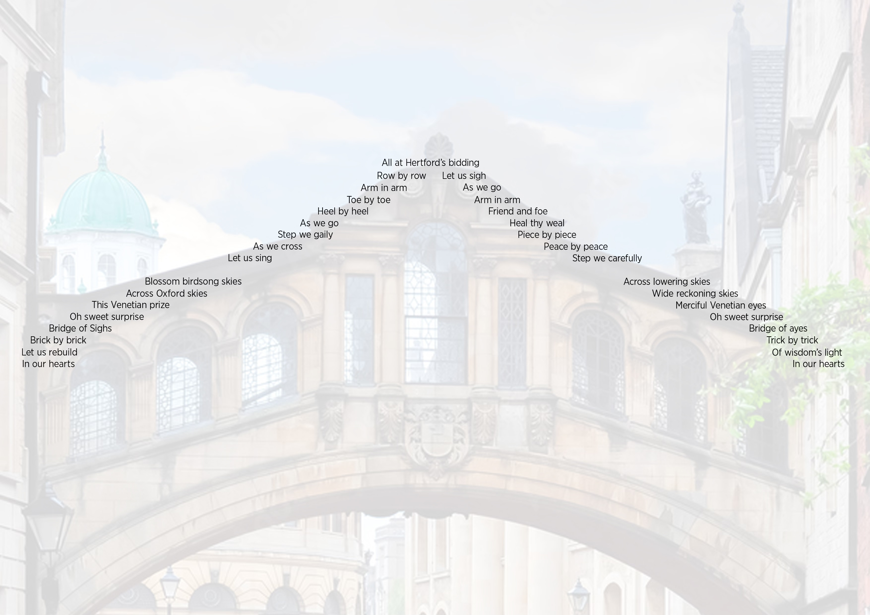 Before going up to Oxford in 1974 I had been on an art appreciation course in Venice, where I had seen the original Bridge of Sighs, as well as the Rialto Bridge. Both these cities hold a special place in my heart as they helped form my aesthetic, and Hertford Bridge, which I often passed on my way to the Radcliffe Camera (a round library that held an extensive collection of Theology books) acted as a reminder and a bridge between the two.
