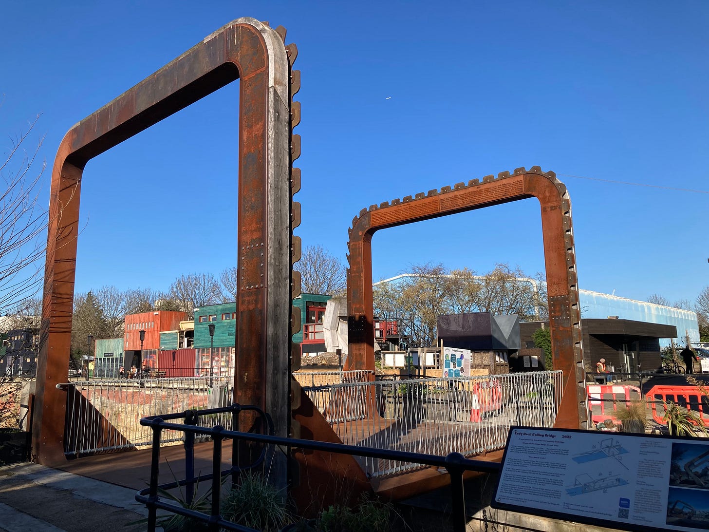 Cody Dock, East London. A haven nobody knows – until they do. Here, a rolling bridge, designed on a square wheel principle (which makes me love it even more) to let boats into the restored coal dock.