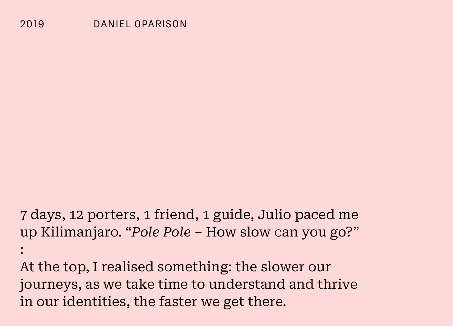 The 20:26 ProjectDaniel Oparison, 2019Daniel chose an event in 2019 when we asked which moment in the last 26 years shaped the person you are today. He had just 46 words, 20:26. Here's how he responded...26Jan 09, 2026201ShareEmail 2026projectinfo@gmail.com to take part in this exciting project.PreviousNext