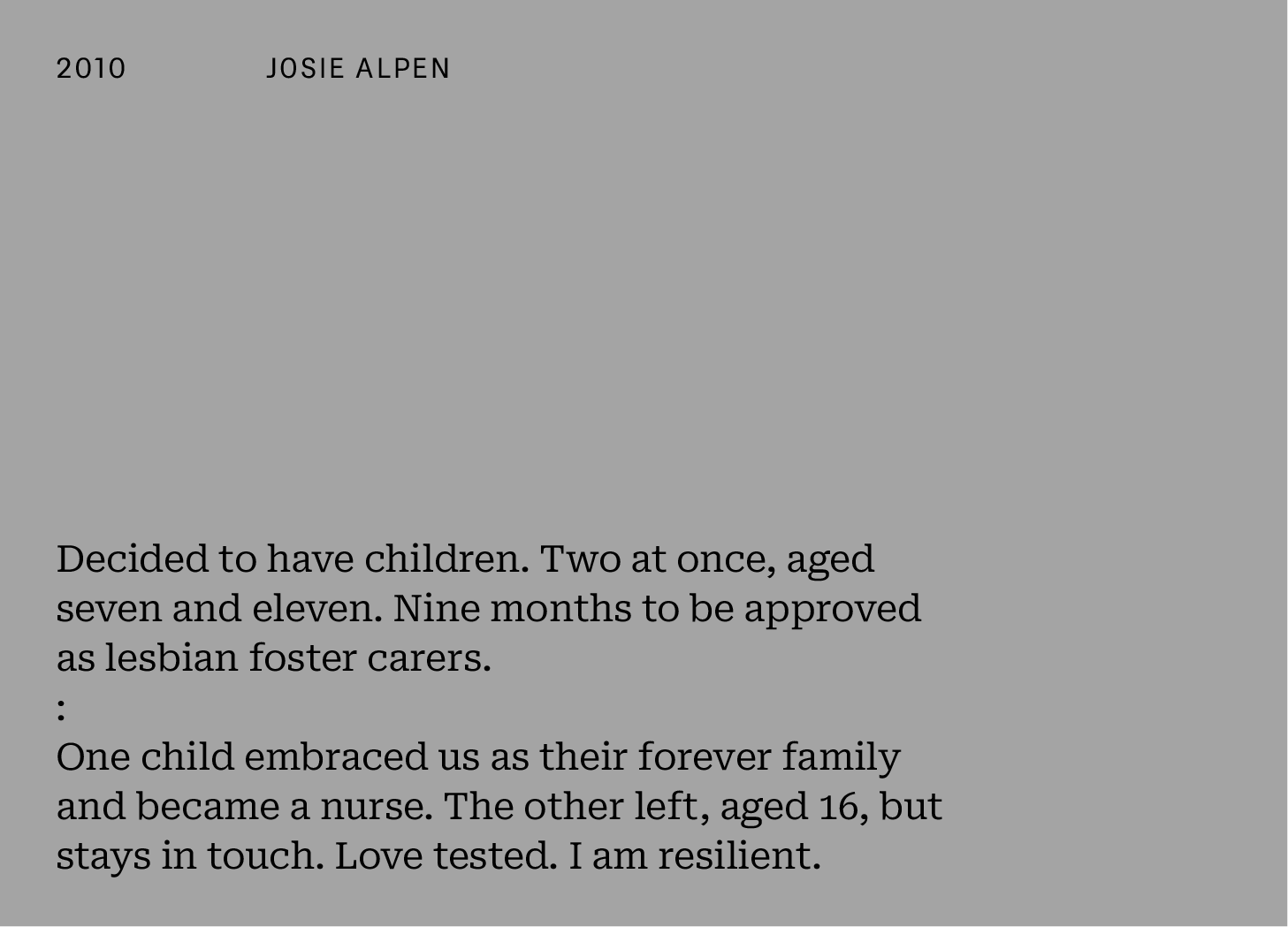 A moving story, succinctly told. Josie describes the journey to fostering in rather more words in a wonderful memoir, A Space in Your Heart.