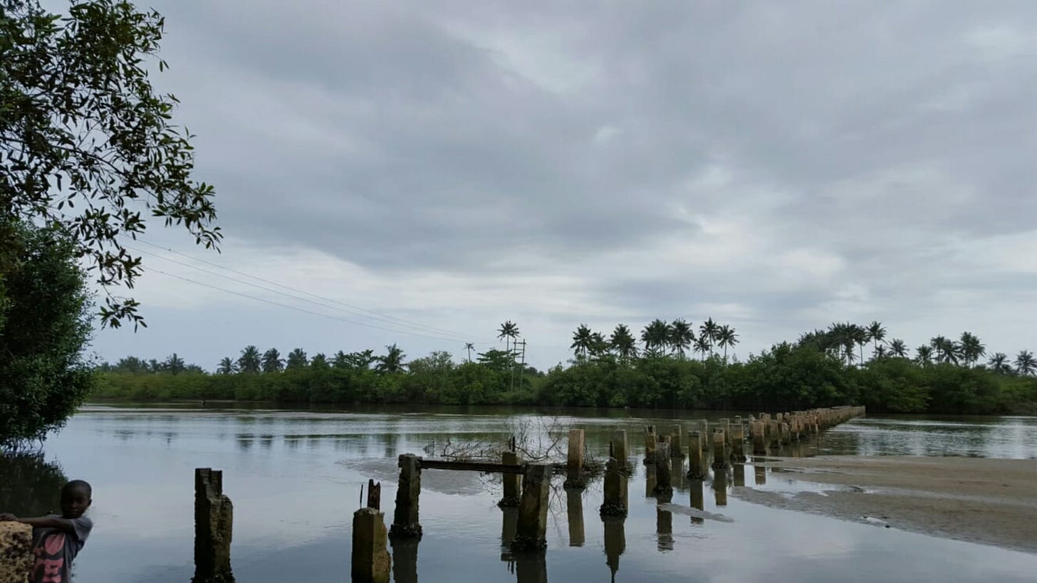 (Lloyd says, “I grew up moving countries quite a lot and I lived in Ghana from 10 to 16 years old. Near one of my friends’ places, in Beach Road, there was a footbridge that crossed a lagoon. The footbridge was quite literally poles with slats of wood over them, and looking back it was really dangerous. Over time, the slats fell off one by one, until we hopped from slat to slat, or even sometimes just the single pole of a bridge. Once a couple friends got swept off and they had to make a chain to grab on to each other. And yet we kept going back, completely oblivious to how reckless and dangerous it was. There’s barely nothing left of the bridge now that would let you cross, but the poles holding up the slats are still there.”)