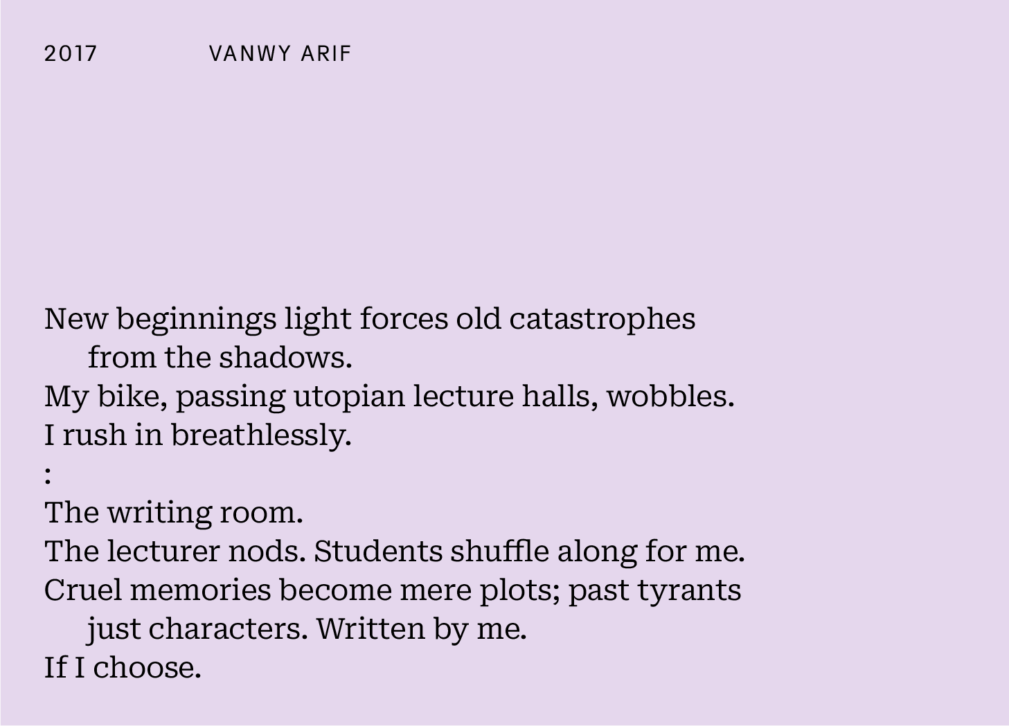 The 20:26 ProjectVanwy Arif, 2017Vanwy chose an event in 2017 when we asked which moment in the last 26 years shaped the person you are today. She had just 46 words, 20:26. Here's how she responded...26Jan 04, 2026155ShareEmail 2026projectinfo@gmail.com to take part in this exciting project.PreviousNext